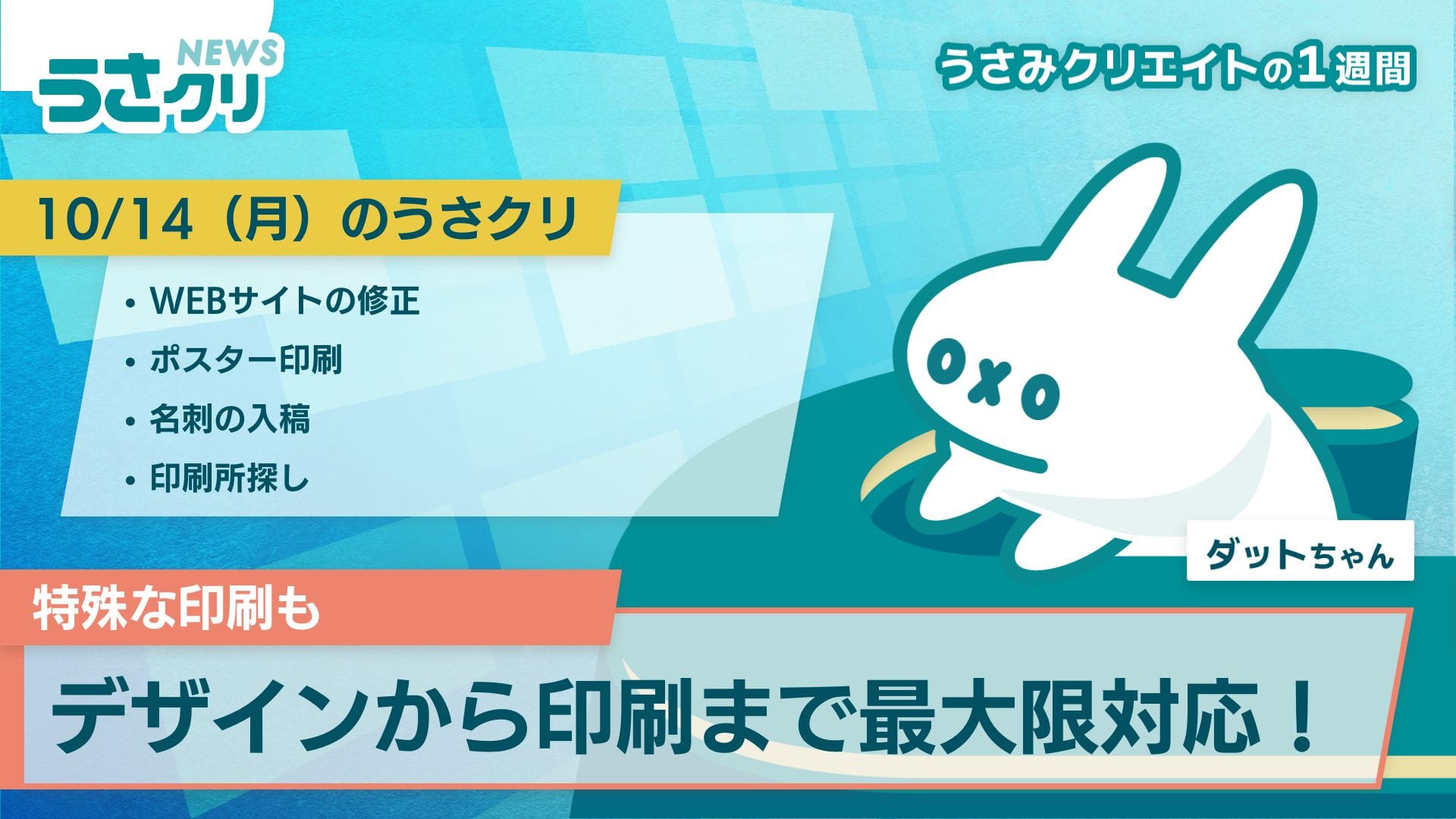 10月7日(月)から13日(日)までの1週間、さまざまな業務に取り組みました。「これってできる?」をカタチにするのが、うさみクリエイトの使命です。